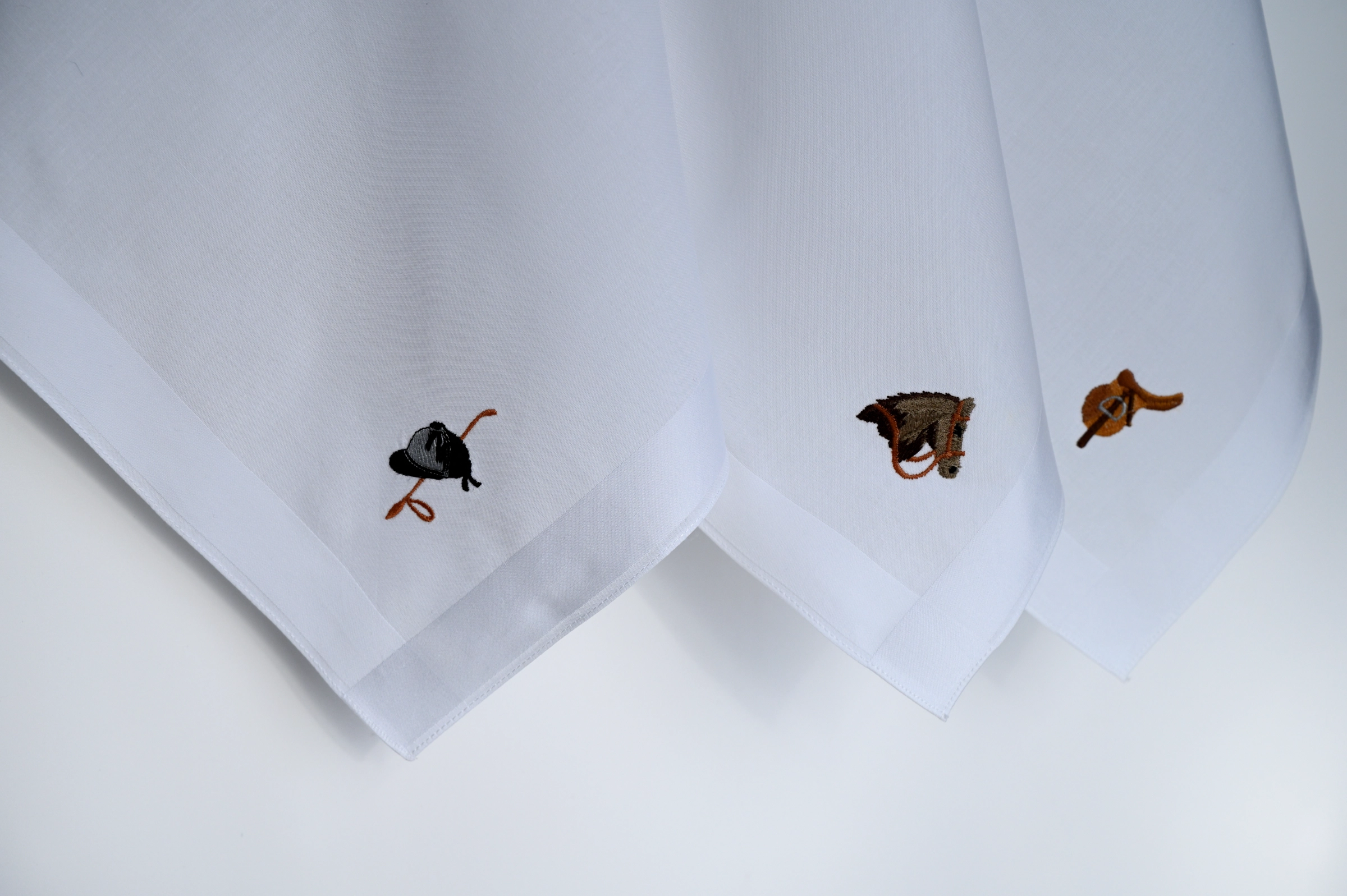 - Embroidered designs include: helmet and crop, horse head, and saddle.